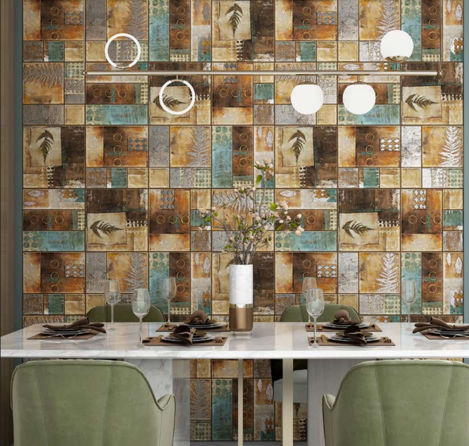 The Mandarin Collection is a masterful blend of vintage charm and modern artistry, a sophisticated nod to the chinoiserie style. Its design features a collage of distressed tiles, each with its own unique pattern, creating a rich tapestry for your walls. The palette of earthy browns, burnt oranges, and muted teals creates a warm and inviting atmosphere.
