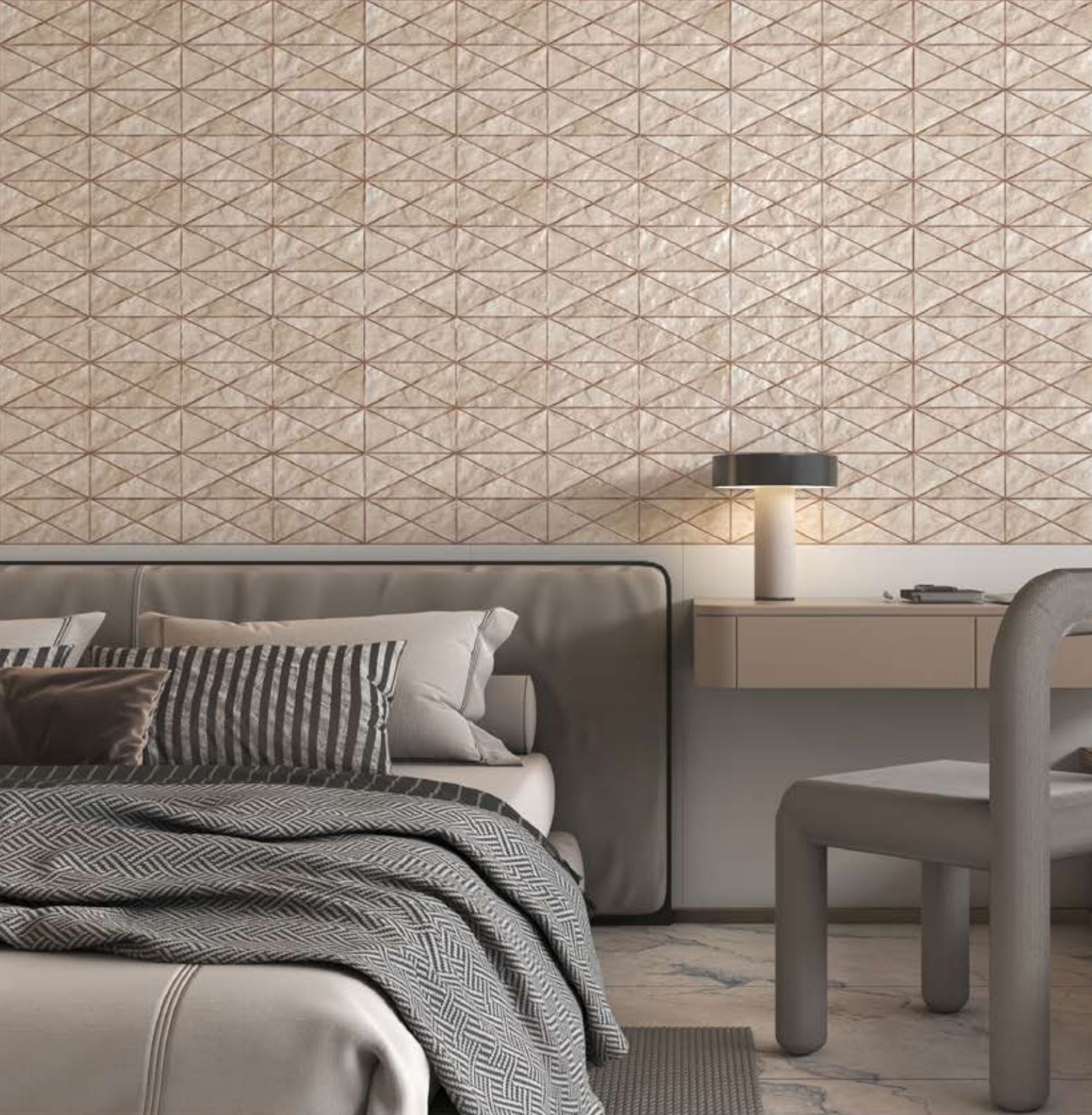Rather than a bold spectrum, the intersecting triangles create a mosaic of texture and shadow. The name still holds true, as the facets of the prism now refract and play with light, revealing a nuanced landscape of off-white, from pure ivory to soft cream and hints of a delicate gray. This version is about quiet elegance, offering a tactile, modern feel that adds visual interest without overpowering the space.