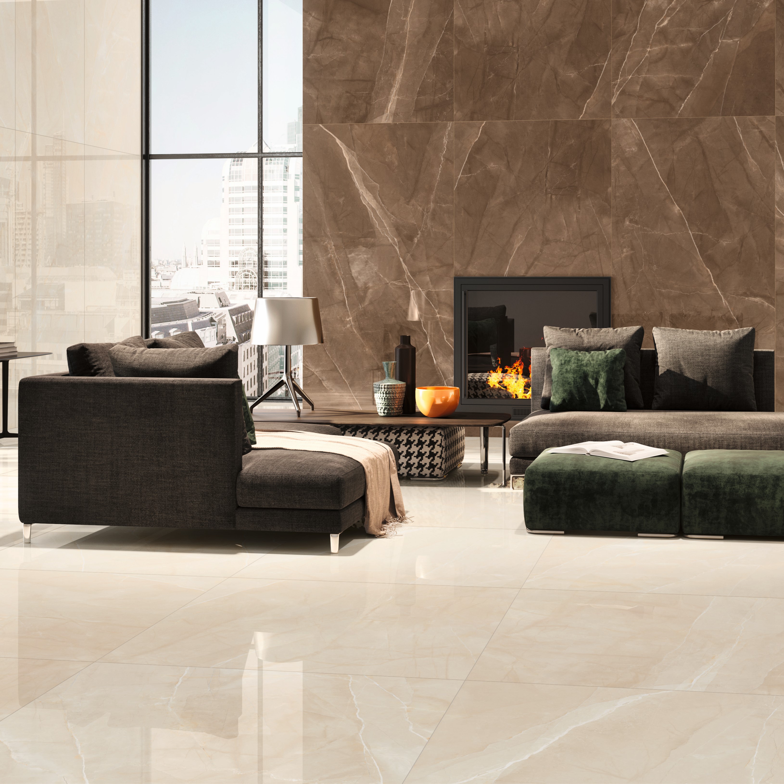 Glossy beige creates a soothing, balanced ambiance for both walls and floors.