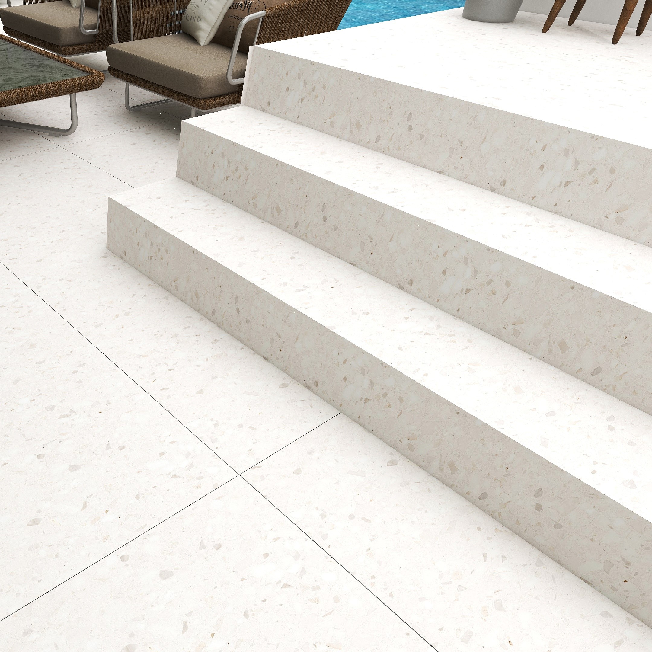 Features a crisp white base adorned with a printed texture in shades of white, beige, and grey. Its rustic finish adds depth and character, creating a timeless, versatile look for both indoor and outdoor spaces.