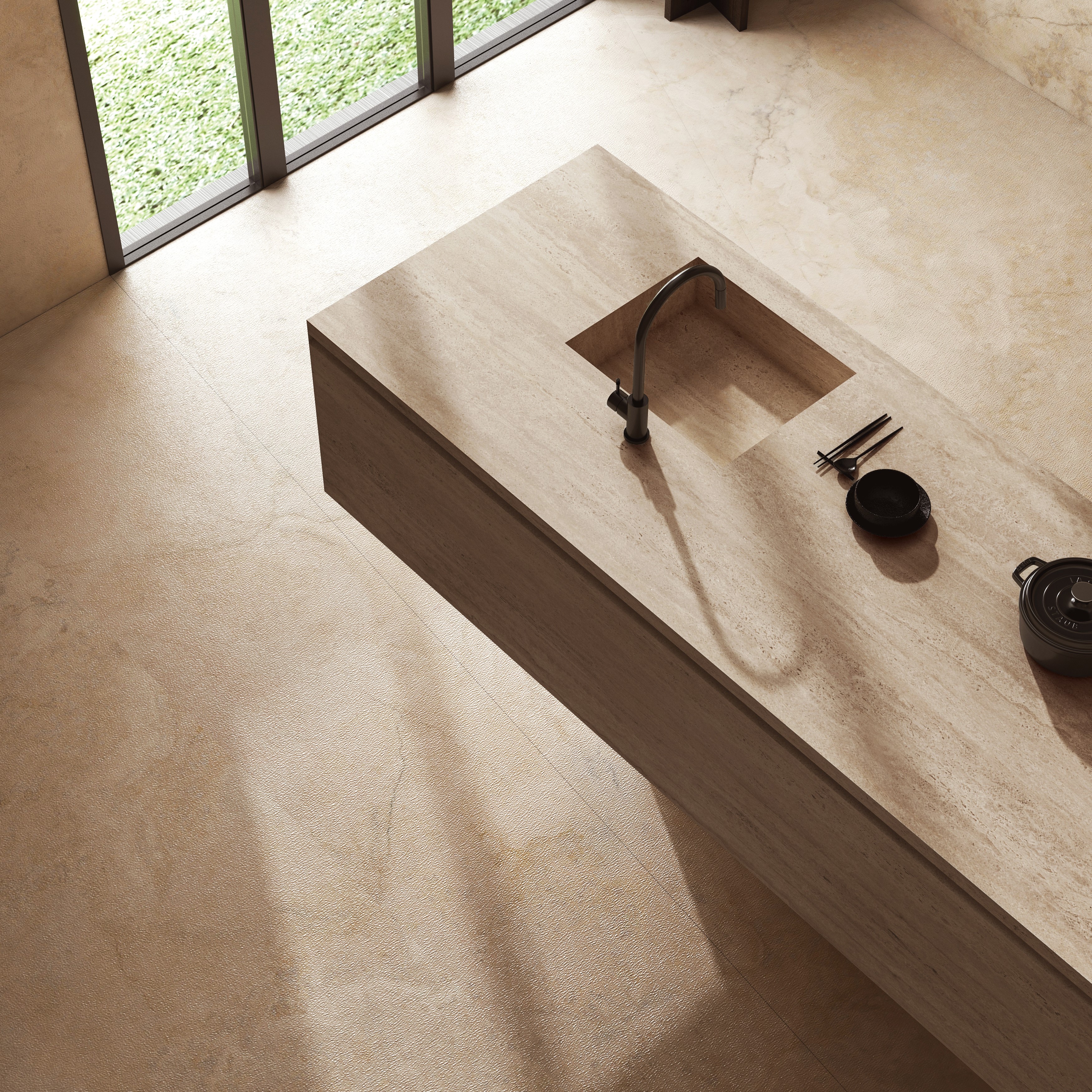 Replicates the beauty of natural travertine with its neutral beige tones, bringing understated sophistication to any space. Inspired by serene, sunlit interiors and calming natural landscapes, it�s perfect for achieving a minimalistic, airy look while maintaining the warmth and texture of real stone.