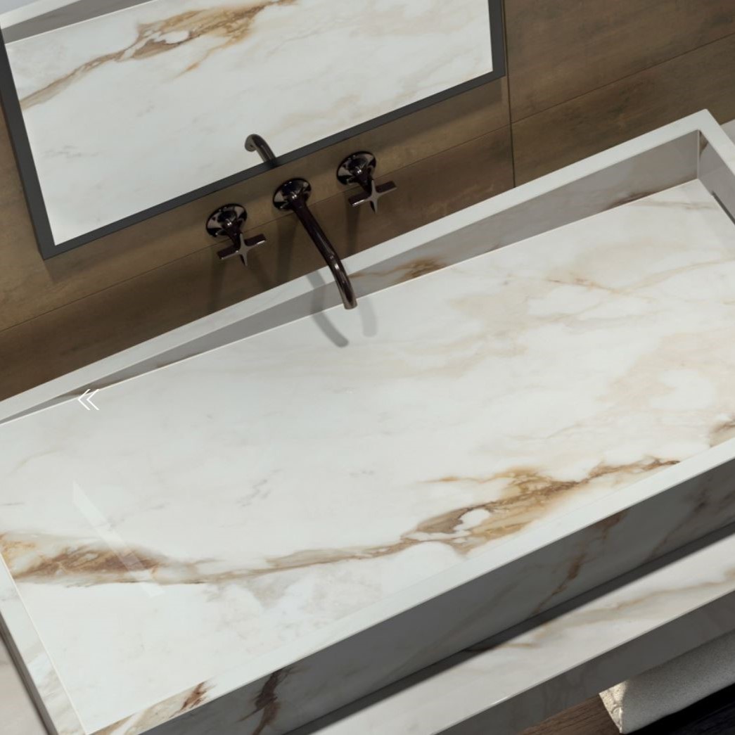 The material is inspired by a precious version of calacatta marble, characterized by wide veins that are rich in shades of color. The rendering led to the construction of an elaborate and, at the same time, elegant graphic movement.