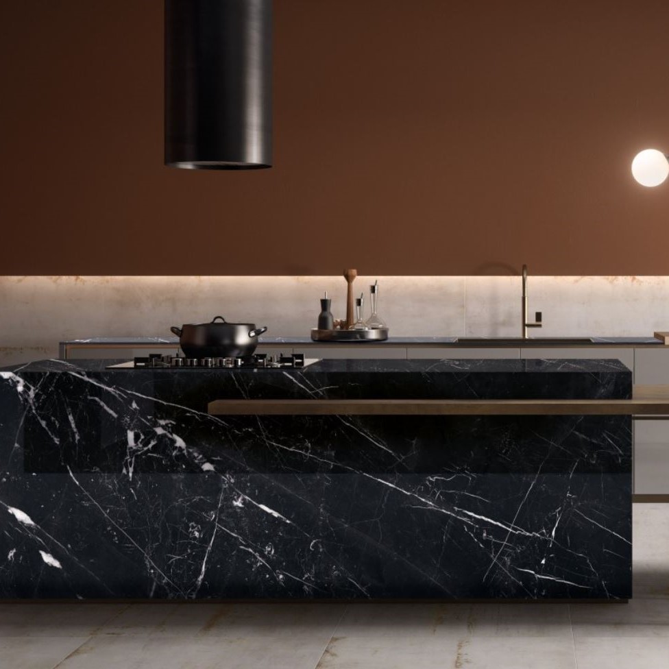 The slabs reproduce the famous Black Marquinia marble, extracted in northern Spain. It is one of the most classic marbles, among the black marbles still today most demanded from the market, due to the extreme elegance of coloring and veining