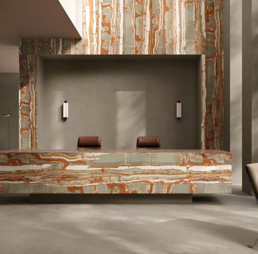 marble-effect porcelain collection offers a contemporary, hi-tech vision of the pursuit of pleasure and the sense of well-being associated with interior design. This concept of luxury redefines the traditional perception of marble through a curated selection of rare varieties, together with onyxes and vibrant coloured quartzites that inspire creativity and a melding of styles and materials.