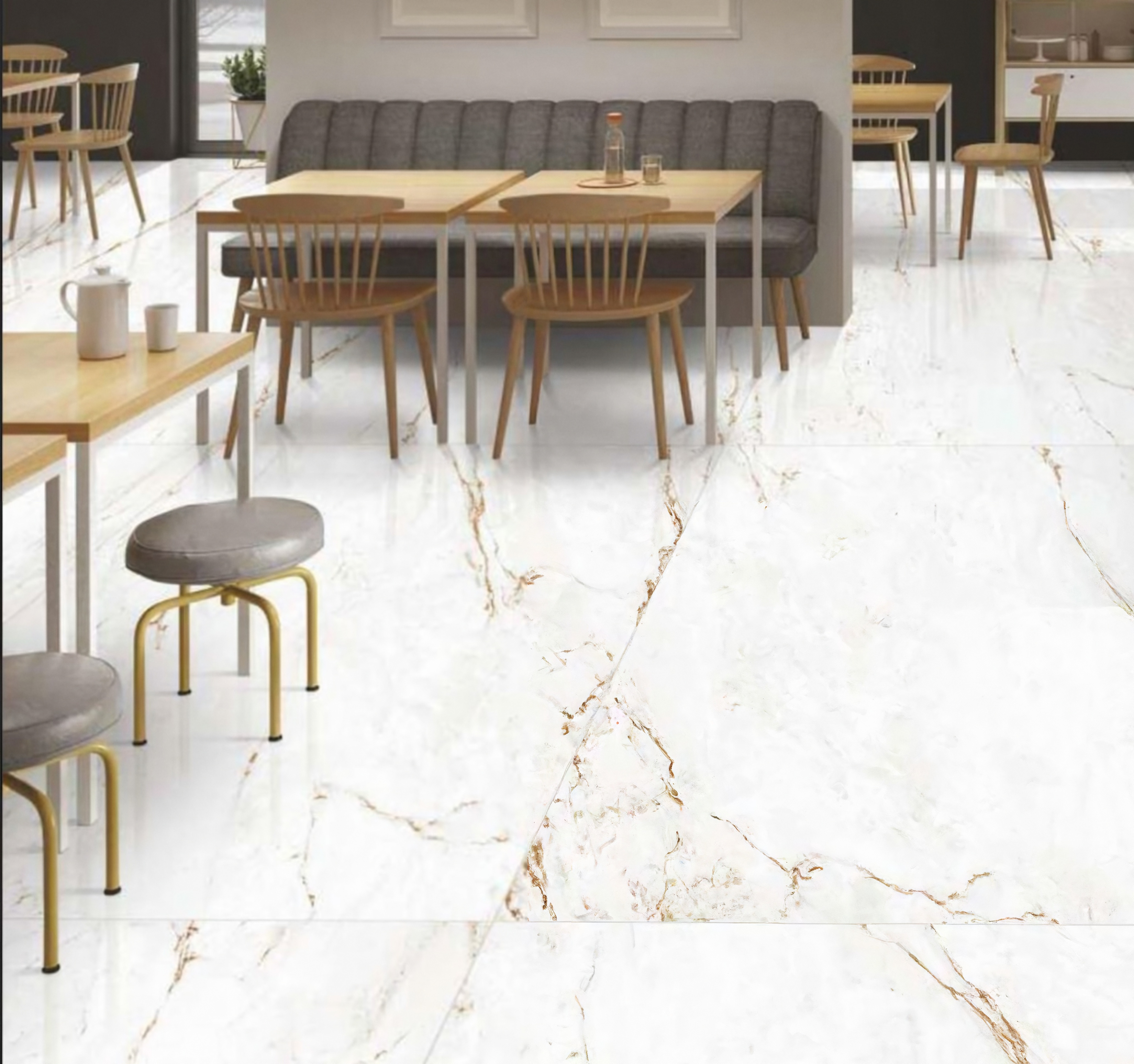 This luxurious tile draws inspiration from classic Carrara marble, featuring a pristine white base accented with elegant gold veining. Its polished surface enhances the natural beauty of the design, creating a sophisticated and opulent look.