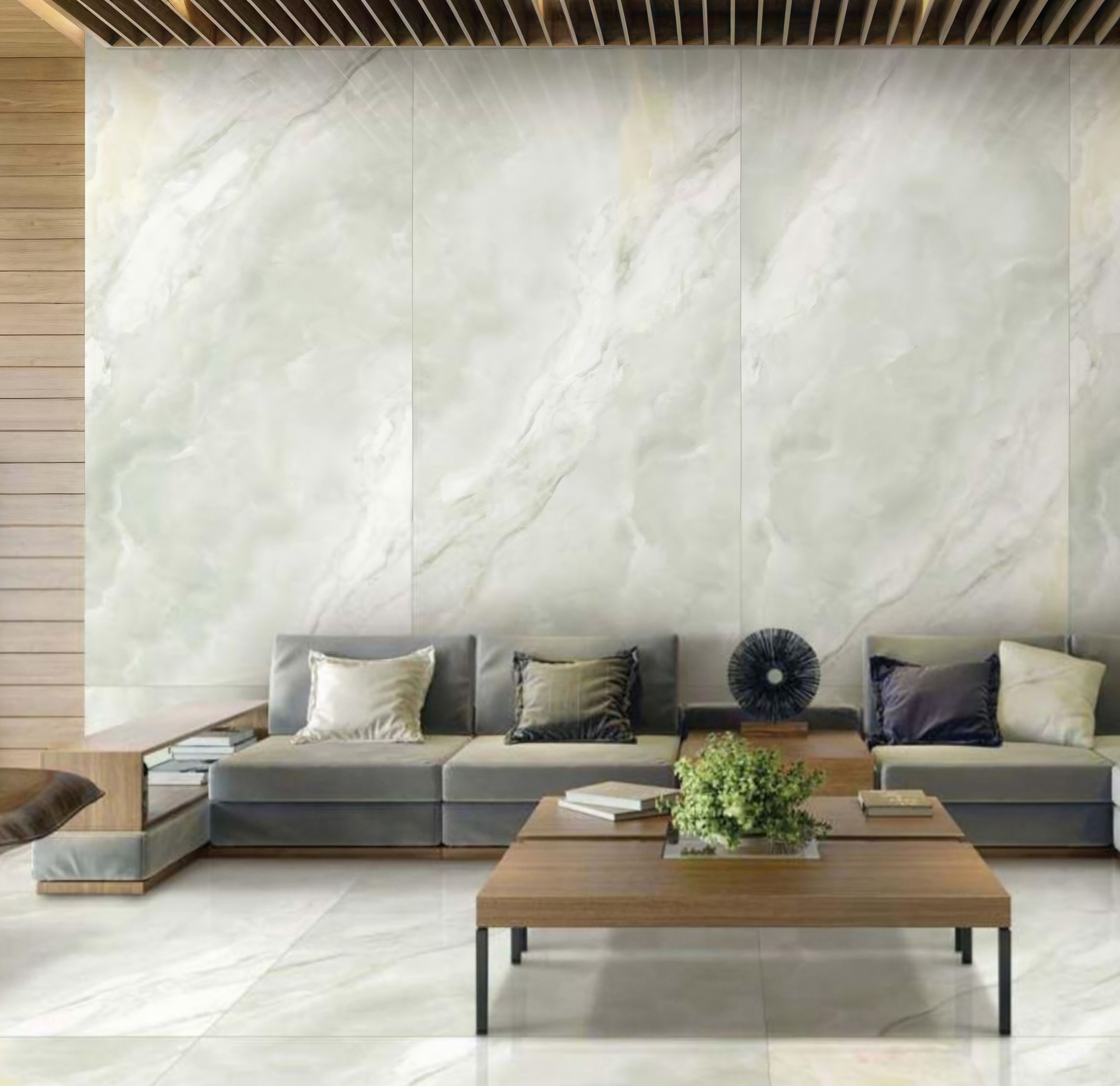 This exquisite tile showcases rich green tones reminiscent of natural onyx, with subtle variations and delicate veining that create depth and elegance. Its polished surface enhances the vibrant hues