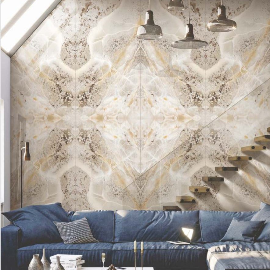 This book-matched slab evokes the natural movement of ocean waves with flowing patterns in gold, grey, white, and beige. Its mirrored design highlights the dynamic textures and color transitions, creating a captivating focal point for feature walls, floors, or statement surfaces that celebrate nature-inspired elegance.